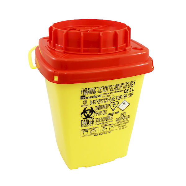 Kolmen litran jäteastia neulojen ja muun riskijätteen hävittämiseen.