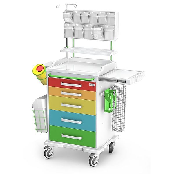Varusteltavissa erilaisilla lisävarusteilla lisävarustekiskojen ansiosta. Kiskoon on mahdollista kiinnittää esim. särmäjäteastia, roskakori, tippateline, imukatetriteline, happipulloteline yms. Laatikot voidaan varustaa hidastemekanismeilla ja lukoilla.