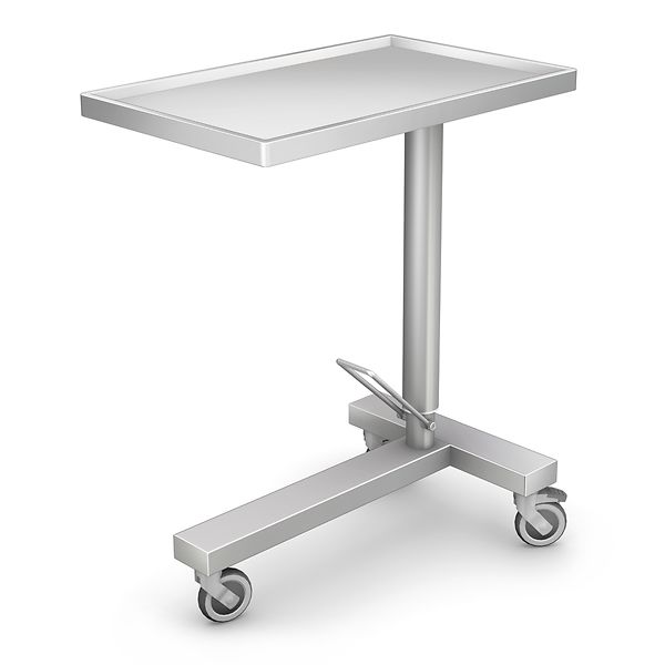 Instrumenttipöytä on valmistettu kokonaan ruostumattomasta teräksestä. Pöydänkannessa syvennys (16mm), 360 asteen horisontaalinen rotaatiosäätö lukolla. Hydraulinen korkeussäätö 960mm - 1330 mm jalkapolkimella. Varustettu kolmella kaksoispyörällä, pyörien halkaisija 100 mm, kaikki pyörät lukittavia.