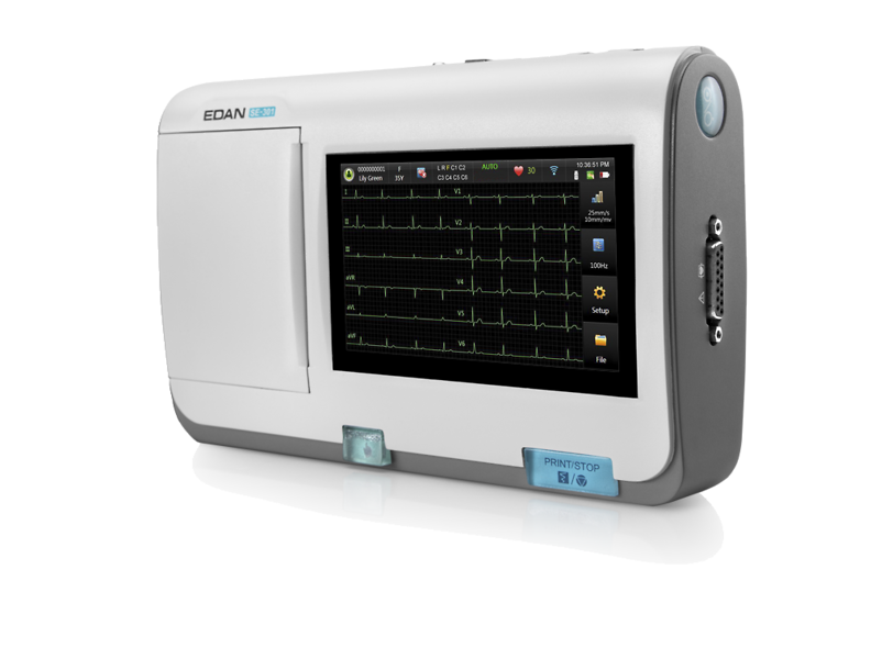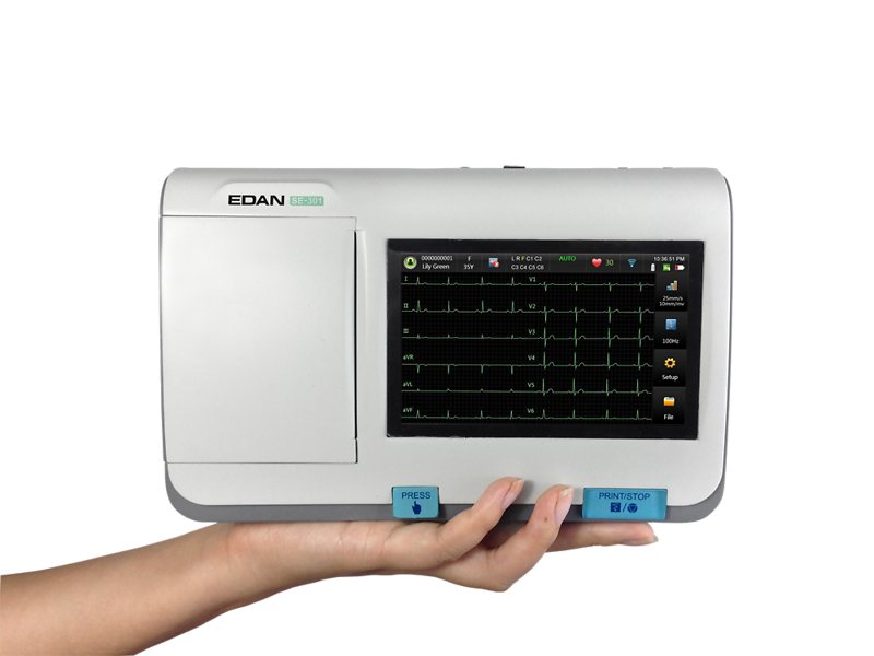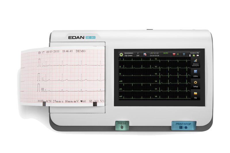 SE-301 on kevyt, hyvin kompakti ja kannettava EKG:n rekisteröinti- ja analysointilaite. Laitteessa on 5" korkearesoluutioinen, värillinen kosketusnäyttö. 12 kanavan yhtäaikainen nauhoitus ja näyttö. Kolmirivisen käyrän tulostaminen tapahtuu sisäänrakennetun, korkealaatuisen lämpöpaperitulostimen avulla. Laite toimii joko verkkovirralla tai ladattavalla Li-ion-akulla. Toiminta-aika täyteen ladatulla akulla n. 8,5h.