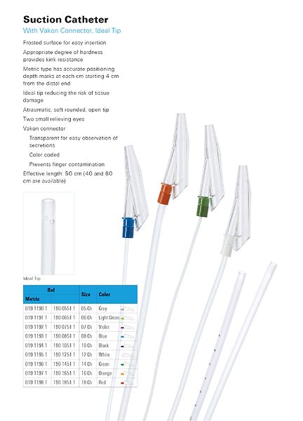Kertakäyttöinen hengitystieimukatetri imusäätimellä. Suora noin 50 cm, kaksi aukkoa, asteikko. Steriilisti pakattu. 100 kpl/pkt.