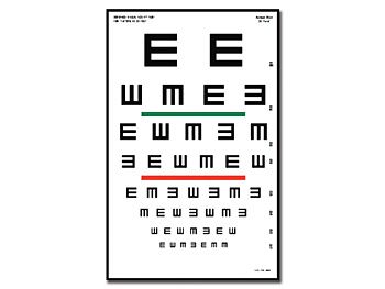 E-taulu näön tutkimiseen. Muovinen, seinälle ripustettava. Koko 23 x 36 cm. Tutkimusetäisyys 6 m.