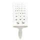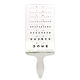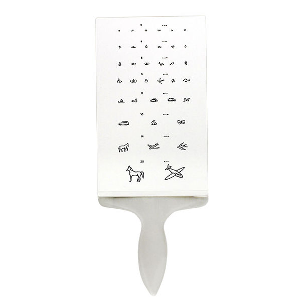 Kätevä kädessä pidettävä näöntutkimustaulu. Toisella puolella symboleja ja toisella puolella kirjaimia. Helppo kuljettaa mukana.