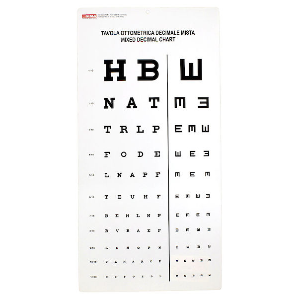Näöntutkimustaulu, jossa sekä kirjaimet että E-symboli. Tutkimusetäisyys 3 m. Heijastamaton mattapinta. Taulun koko 28 x 56 cm.